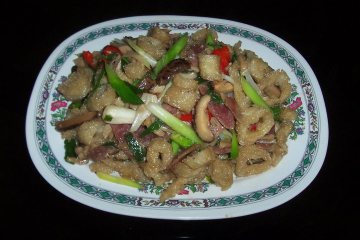 接着依次将鱼鳔干/腊肠/香菇连同油水/蘑菇/红辣椒/大蒜加入一起烩炒。