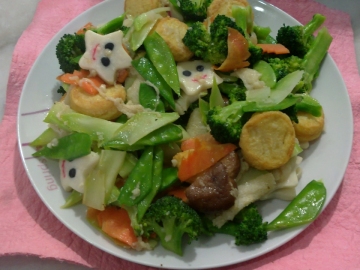 ②爆香蒜茸,倒入花椰菜、香菇、萝卜片、甜豆片、星星鱼丸(中间切下成2片)、竹笙翻炒均匀撒入适量盐拌炒后入日本豆腐及勾芡即可。