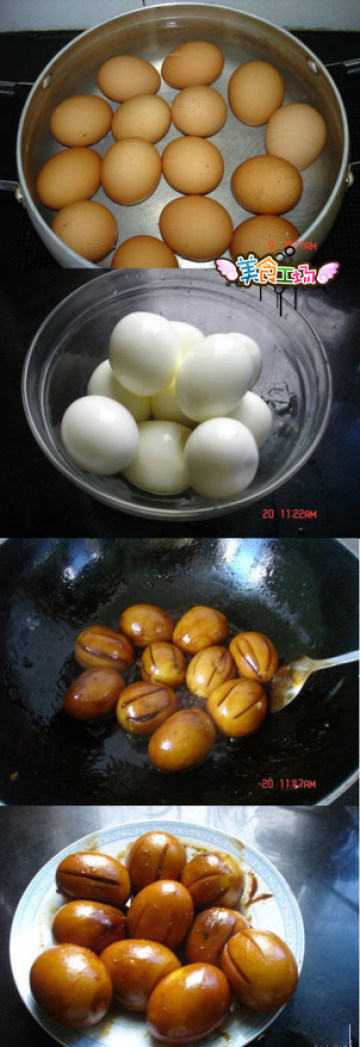 材料:鸡蛋,白糖两大勺,盐一小勺备注:盐一小勺,糖两大勺,酱油一小勺,啤酒一瓶,鸡蛋口切深点,小火多煮会。