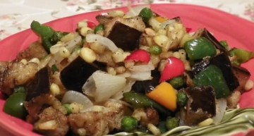 五、开锅,放葱茸蒜茸,爆香后倒入一半的茄子丁,全部蔬菜,翻几下,放几滴料酒、洒黑胡椒,粉点入精盐和一点点糖,快速翻匀,装盘。