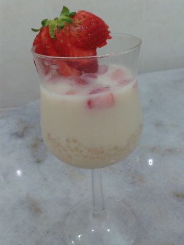 草莓适量,沙谷米80克,豆奶500克,蜂蜜20克,鱼胶粉8克,糖30克