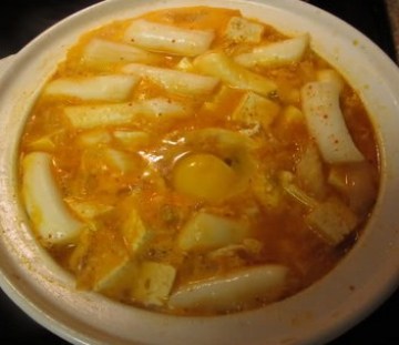 3. 倒入鸡汤,煮滚之后放入豆腐,再次煮滚之后放入粘糕,小火焖7,8分钟,临出锅前打一个鸡蛋在汤里,用热汤焖个温泉蛋