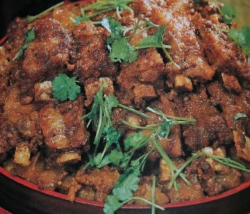 2。将排骨用温水洗净,斩成6厘米长的段,花椒、葱叶混合铡成细粒, 与酱油、甜面酱、醪糟汁、郫县豆瓣(剁细),肉汤拌入排骨肉,再依次拌入米粉50克,油。
