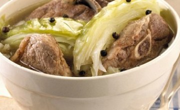 2,汤锅底层,放下一层羊肉,羊肉上再放一层卷心菜。然后再放一层羊肉,卷心菜。层层放置压紧。