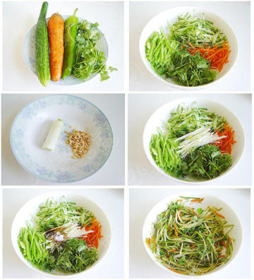 1、 香菜切段,青椒、胡萝卜、黄瓜切丝。