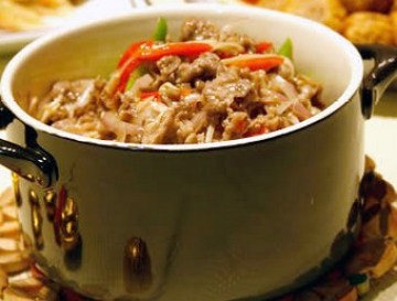 3.炒锅加2大勺油爆香青,红椒和洋葱,加调味料(2),一杯清水及金菇炒软,再放牛肉,炒至入味,用调味料(3)勾芡,盛放在加热的沙锅内。