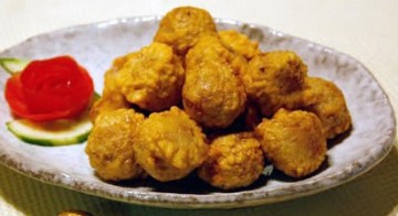 3.油锅烧至6成热时,丸子挂糊炸至金黄即可上碟。吃时可蘸花椒盐或甜酸汁。