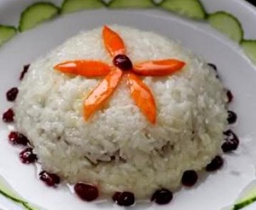 5,将做好的糯米饭放入笼屉里蒸二十分钟。蒸好后取出倒扣于盘中。转动几下碗,将碗掀开。