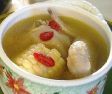 2、两物入汤罐,加老姜一块、好酒少许、玉米块、枸杞,加水至盖没食材;