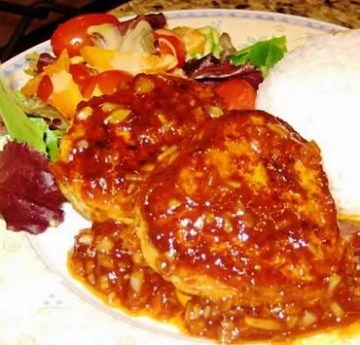用煎汉堡的锅加入white wine 3 tbs, 番茄酱2tbs,worcestershire sauce1tbs 调稠酱汁出锅前放入1/3个洋葱末。将酱汁浇到汉堡上就好了。