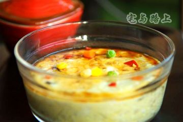 3、上面的蔬菜粒是已经煮熟的,做其它菜用的,豆腐蒸好后顺手洒上几颗点缀一下,可以省略。