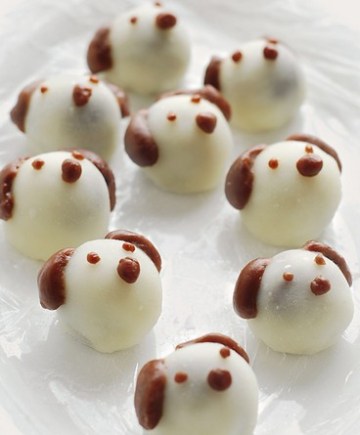 5、把巧克力隔水加热化开或者用微波炉化开,揉入剩下的1/3糯米面团,直到面团均匀着色,整体呈巧克力色为止,分别取小块,揉圆,做成小狗的耳朵,鼻子和眼睛,粘在做好的糯米糍团子上。