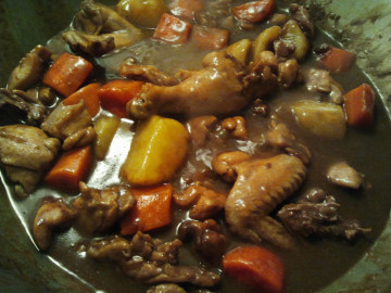 童子鸡一只丶土豆丶萝卜丶洋葱丶咖哩丶鸡汤丶椰汁丶糖丶盐丶绍酒