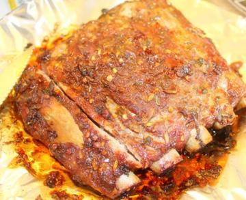 5、过1个把小时的时候,倒出汤汁(有的可能在调料中未放什么液体也就没什么汤汁),排骨翻面,继续放入烤箱,华氏400度再烤20分钟至半个小时即可。
