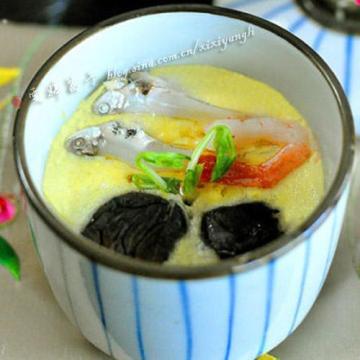 主料:鸡蛋1个,菠菜叶2片,小香菇2朵或3片,新鲜小鱼2条,虾仁1个,豌豆苗