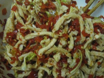4. 将泡过的萝卜干放在一个较大的碗里,加入剁椒与萝卜一起混合拌匀,剁椒不要太多,也不可太少,