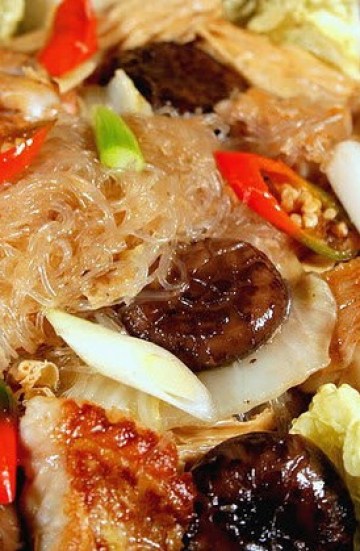 做法:石班洗净后切成块腌少许料酒,盐,糖,一点生粉二十分钟后煎微黄备用.冬菇,腐竹切段与粉丝剪半用温水泡发备用,绍菜切大片与粉丝一同先置入砂锅里备用.烧热锅下一大匙油爆香蒜片与姜片爆香后放蚝油微爆再下冬菇炒香,下料酒与高汤转小火焖二十分钟后下腐竹再焖至微软盛出备用.再热锅下两大匙油放蒜片后下蚝油爆出香味,再下鱼块大火爆炒,然后把冬菇,腐竹与汁一起倒进蓋蓋大滚数分钟后,下些红椒与葱段再放盐,糖,味精等调好味后,再大火滚至收汁即可出菜,出菜前放点胡椒粉与麻油就可以开吃.
