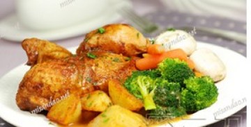 4)不锈钢锅放油,稍热后放入抹好调味料的鸡,煎半分钟后入烤箱450f烤(bake)30分钟,取出拌入mirepox,此时烤箱调温至375f,放入鸡和mirepox再烤(bake)1个小时;