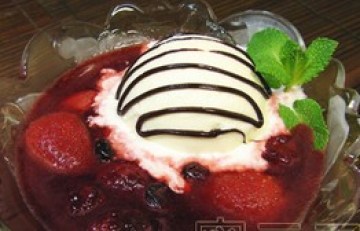 2)把黑红莓连汁分装在碟子里,放一个香草冰激淋球,上面挤一些巧克力装饰。