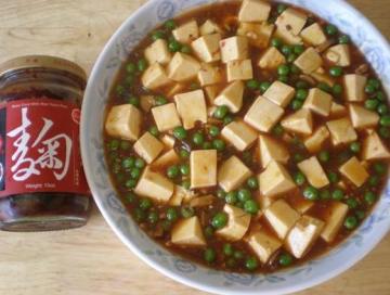 2、再将切好的豆腐块和青豆倒下去,翻两翻;