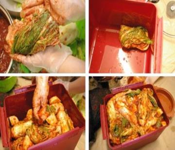 5)做好的泡菜,放在小箱子的密封,室温放3天。3天后开盖子,这个时候有很多的水和起跑,用筷子或者用的顺手的东西吧泡菜大概的翻一下,叫里面的气泡跑出来,然后用力把白菜往下压,直到气泡消失。放入冰箱,两周后可以开吃了。