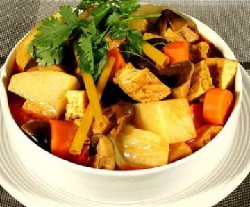 4、再收中小火煮五分钟后,下土豆块、腐枝与椰菜片,滚后以中小火煮至汤汁略收& #40;约三十分钟。因有椰乳汁汤会自稠不用勾芡,再放调味品盐、糖、味精熄火即可出菜。
