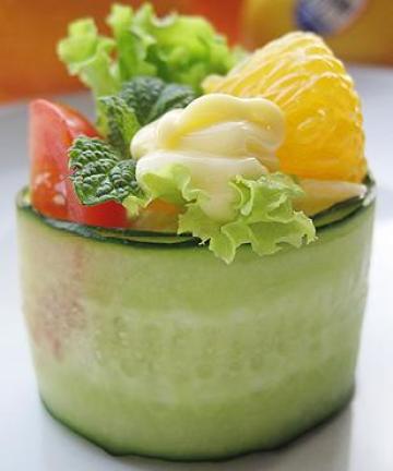 5. 将甜橙果肉、生菜、小西红柿、球生菜混合,淋上柠檬汁装入黄瓜盅内;