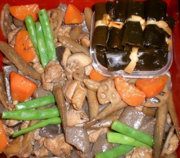 鸡肉1只,蒟蒻45g,牛蒡1/2条,鲜笋1/2条,红萝卜1/4条,干辣椒2条,莲藕50g,香菇2朵,四季豆2g,盐少许,芝麻油适量,酱油少许,酒少许,出汁:1大匙,酱油3/2大匙,味醂1/2大匙,酒1/2大匙,水150㏄