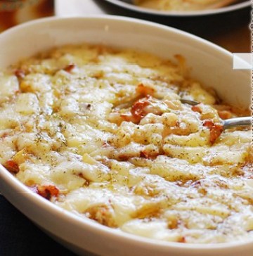 5.然后盛在烤盆里,撒上碎芝士,烤箱预热210摄氏度,烤10分钟就可以了。