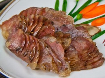 青椒猪肝、翡翠芝麻卷、菠萝蜜汁烤火腿。