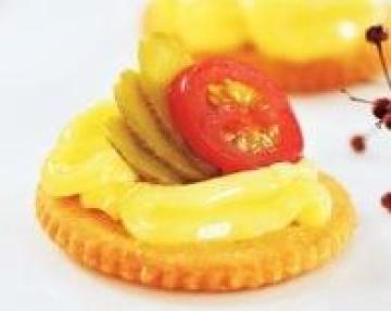 1. 将熟蛋黄碾碎,调入蛋黄酱搅打均匀,再挤在乐之饼干上。