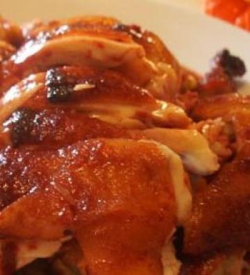 5、5-6个小时以后将整只鸡放在瓷器盘上送进微波炉,先微波高火4分钟;再混合烹调(高)8分钟;接着取出,在鸡身涂上酱料,放在烧烤架上,两边分别烤4--5分钟