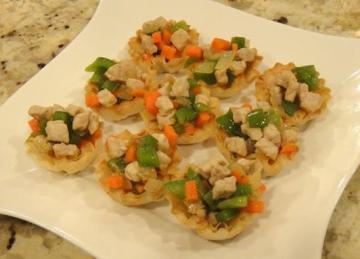 3.烤箱预热 350f。超市买的 mini fillo shell(如图)放在烤盘上进烤箱大概 3-5 分钟。主要是为了让 shell 变得 crispy。然后把炒好的三丁用小勺装入 shell 就行了。