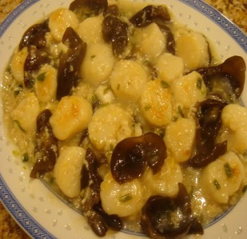 3、热锅加油炒香姜末、葱末,加酒酿、绍酒、糖、盐、味精,加木耳拌炒。