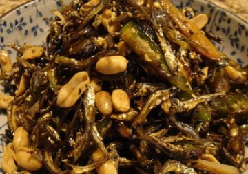 用半杯热油炒香葱和辣椒,取出葱和辣椒,用留下的油炒小鱼致金黄,香脆,加豆鼓炒几下,下酒溜锅边,加yoshida sauce,葱和辣椒回锅,加少量盐,加花生,芝麻,拌匀,起锅.