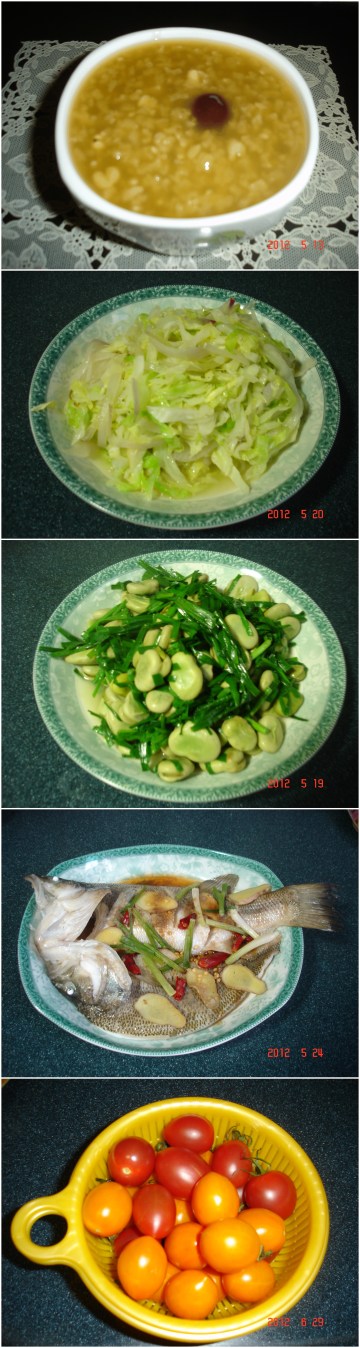 香甜米仁粥一碗,洋葱炒包菜100克,烩韭菜50克,清蒸鲈鱼50克,各类水果100克。