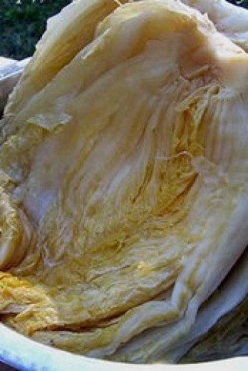 4.在冷的地方使其慢慢发酵,渍好的酸菜颜色白里透黄,清爽脆生,酸菜心儿更是酸脆中还夹带着丝丝甜味。