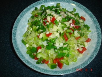 3.在挤好的包心菜丝上加入适量的味精、胡椒粉、麻油拌匀装盘。撒上红青椒末、蒜末、葱花。