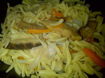 炒锅置火上烧热,加油,放入洋葱丝炒出香味后,放入空心粉,萝卜丝,香菇丝翻炒,再加少许水,盐,鸡精翻炒片刻后。