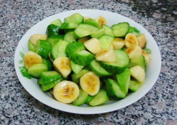 2.用一个稍大点儿的小盆盛刚切好的香蕉块、黄瓜块,加糖后晃动小盆,直至变黏糊为止,装盘就ok啦!