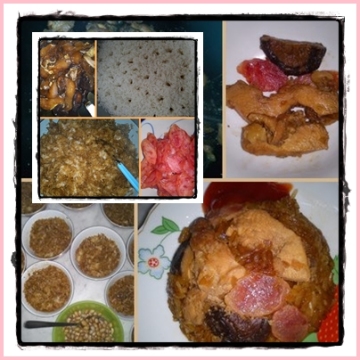 2.第2日,将原料中除糯米外的食材洗净,切成2-3cm见方的小丁备用;瘦肉切丁后用生抽腌制;