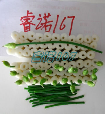 1准备好空心年糕和韭菜花 把韭菜花插入空心年糕内备用 2倒入食用油和方便面酱料小炒下 然后加入少许水再倒入年糕翻炒 炒到韭菜花熟了即可