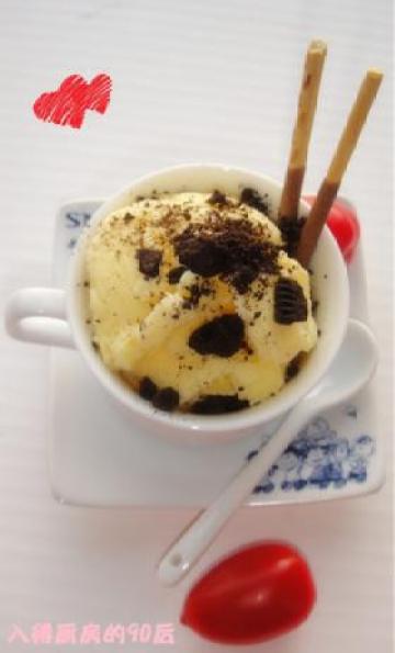 我在吃的时候 还撒了些“奥利奥”的饼干碎把“奥利奥夹心饼干”的夹心去掉,把奥利奥饼干放在保鲜袋里捏碎再撒到冻好的冰激凌上。(您也可以放些自己爱吃的水果或者果酱)ok!大功告成啦。