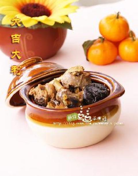 2、炒锅中入油,油热后放姜片、大蒜头呛锅,下鸡块烹炒到微黄,喷入糯米酒,加入香菇,中小火煮40分钟,至鸡肉熟透即可,起锅前加入适量盐调味。