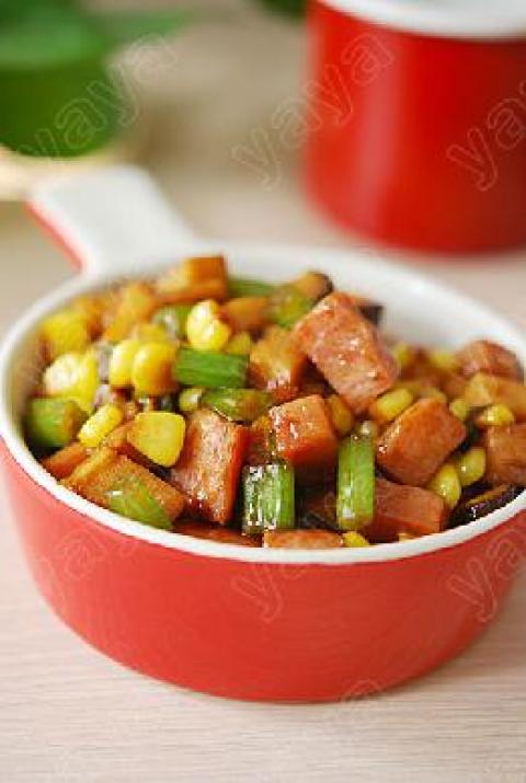 6】下玉米粒,火腿丁和酱汁翻炒至酱汁收干,均匀裹在食材上即可
