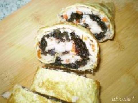 4.摊好的鸡蛋饼上铺一层紫菜/海苔片(我妈说不喜欢外面卖的海苔片一股甜味 所以我换成紫菜了 乃们可以自己选择哈)然后将刚刚搅拌好的馅料均匀铺在上面 卷成鸡蛋卷