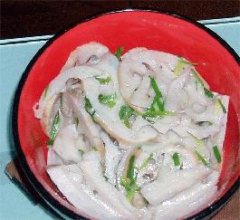 2.起油锅,下藕片,炒至出浆即可加盐调味,再撒入葱花即成
