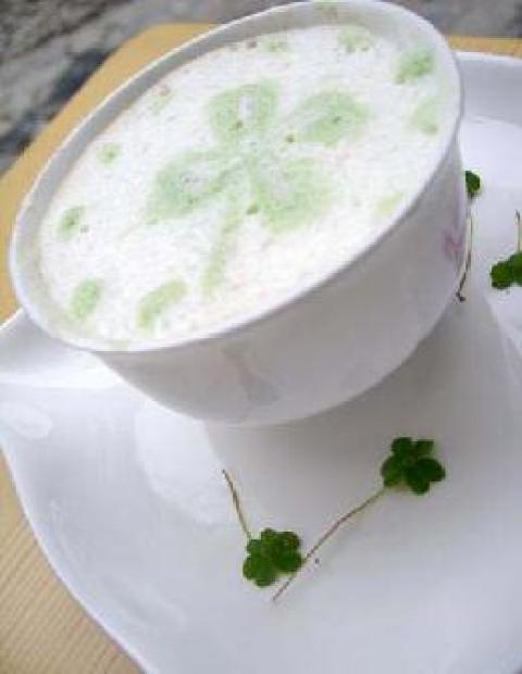 5、用牙签沾取绿茶奶泡画出四叶草的样子~