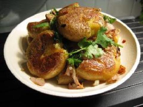3.不沾平底锅放油,放入洋葱碎,略炒出香味后加入压扁的小土豆,用中火将小土豆一面煎黄再煎另一面,煎的中途适量撒上孜然、盐、辣椒粉,最后洒上香菜。