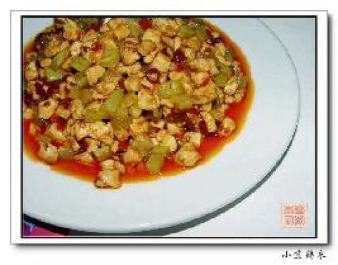 4.往锅内倒油,烧热,下鸡肉炒散,加泡椒、姜、蒜炒出香味,再下青笋、芹菜、葱炒匀,汁收浓后即成。